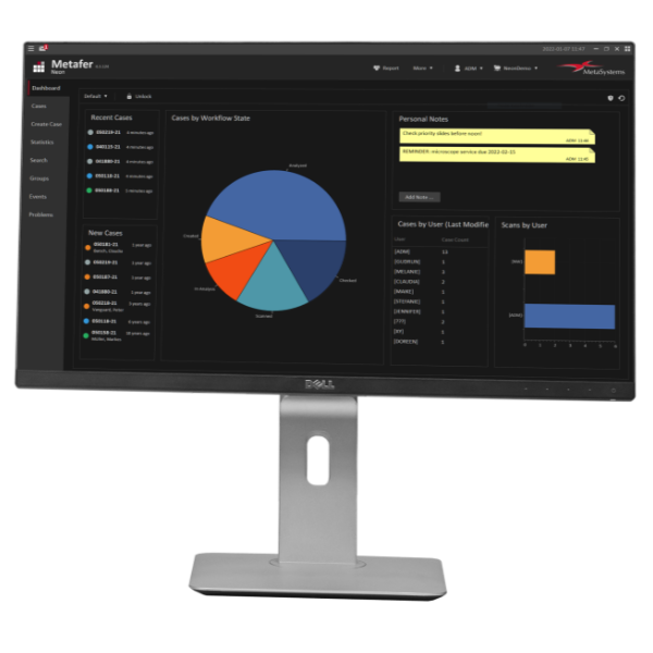 Neon is the interface for case and image data organization integrated in all Ikaros and Metafer installations. MetaSystems solutions are designed to address particular imaging and image analysis tasks. Neon collects the data from any imaging job and also from external sources and presents them in a comprehensive and versatile case management dashboard. Hence, Neon always has the most relevant information for the user at hand; fast, secure, and no matter from where the information originates. Strong data management algorithms, several convenient display modes, and many options for selecting and filtering content make Neon the perfect basis to organize large quantities of heterogeneous information.