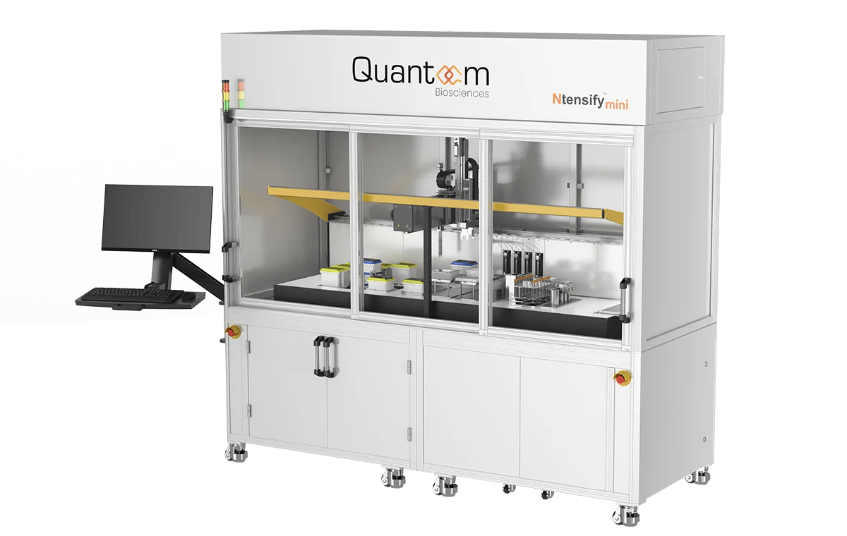 The Ntensify mini is a research-grade RNA production system introducing a novel approach to RNA synthesis and purification. Both synthesis and purification steps are automated in a single system to enable production of up to 48 different RNA constructs at a 2mg scale (multiplexing) or a single RNA construct at a 100mg scale (pooled).