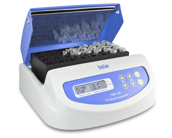 TDB-120 is a traditional Biosan’s dry block thermostat for laboratory analysis. Thermostat is designed for maintaining constant temperature of samples in tubes inserted in the aluminium block sockets. Unprecedented high precision and uniformity of temperature over the block. TDB-120 is widely used for PCR–analysis.